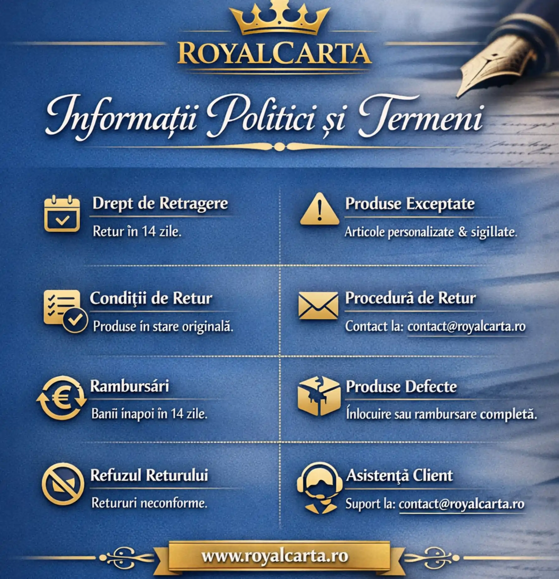 Dacă aveți întrebări, contactați-ne: contact@royalcarta.ro.